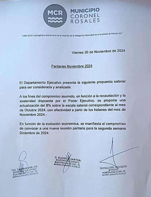 Desde el Sindicato de Trabajadores Municipales de Coronel Rosales informan a los compañeros municipales que en la asamblea informativa llevada a cabo en la tarde del día lunes en torno a las propuestas por reuniones paritarias se ha dispuesto rechazar el ofrecimiento del gobierno local.