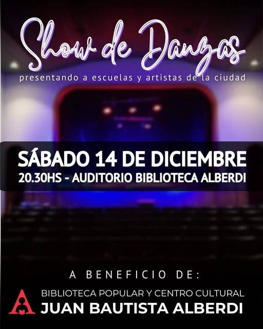SÁBADO 14 - 20.30HS Los esperamos en el auditorio de la Biblioteca Alberdi con un show a beneficio de esta institución. Ayúdanos a colaborar con ellos y vení a disfrutar de este evento presentando a: Agrupación de Danzas Caporales Willca Tusuy Agrupación Folclórica Nuevas Raíces Grupo independiente Rudd Ones Academia X Estudio de Danzas Y al taller de teatro presentando un fragmento de su obra "Mundo Mítico" Las entradas anticipadas están a la venta desde hoy y las podes conseguir de 18 a 20hs en Rivadavia 351 (pasillo al fondo)