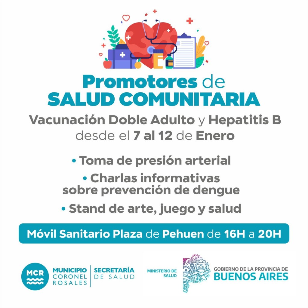 Campaña de vacunación Doble Adulto y Hepatitis B.Desde la Secretaría de Salud del Municipio de Coronel Rosales informa a la comunidad que en Pehuen Co se encuentra el Móvil Sanitario con Promotores de Salud Comunitaria