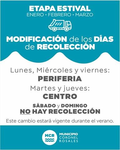 A partir del lunes 13 de enero, se modifican los días de recolección de residuos debido a la temporada estival.