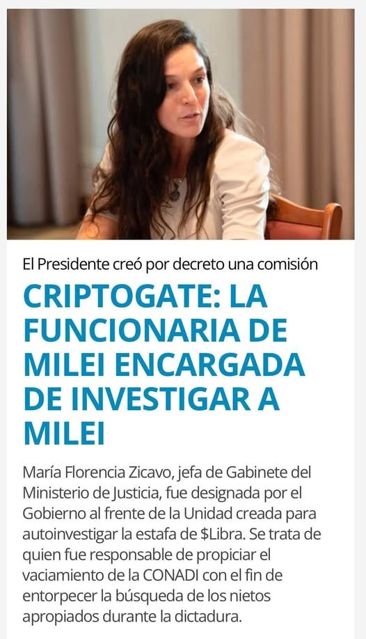 La jefa de asesores del Ministerio de Justicia estará a cargo de la "Unidad de Tareas de Investigación" creada por el escándalo cripto. Milei se investiga asi mismo!!!