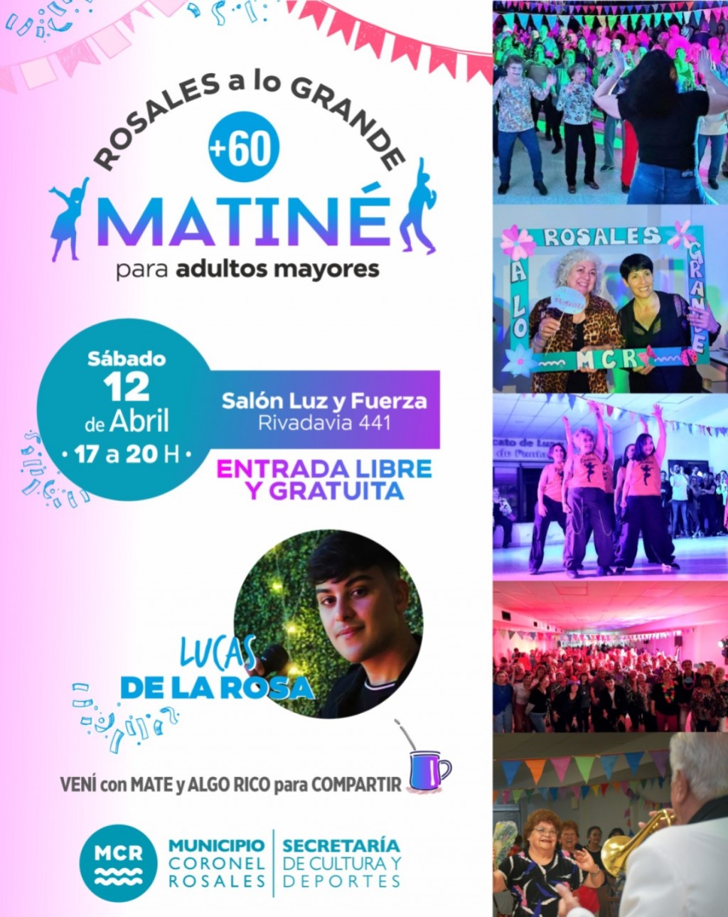 El próximo sábado 12 de abril, de 17:00 a 20:00 horas, se llevará a cabo una nueva edición de la Matiné +60 en el Salón Luz y Fuerza (Rivadavia 439). Esta propuesta recreativa, organizada por el Municipio a través de la Secretaría de Cultura y Deporte, invita a los adultos mayores a disfrutar de una tarde de baile, música y karaoke.