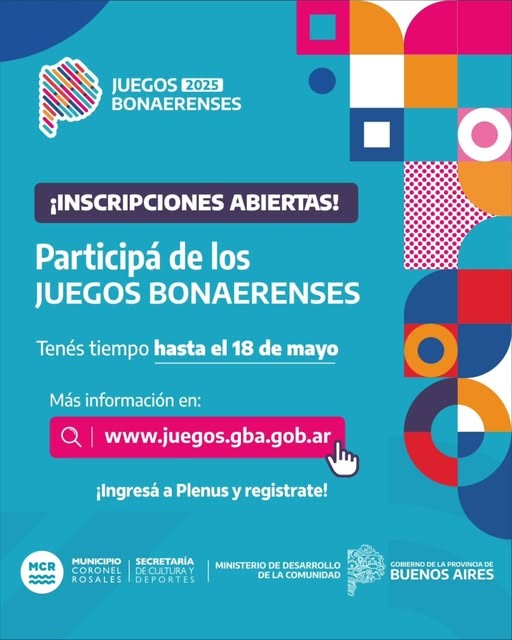 ¡Ya están abiertas las inscripciones para los Juegos Bonaerenses 2025! Si tenés ganas de competir y representar a la ciudad, ¡esta es tu oportunidad! Las inscripciones son libres y gratuitas, y tenés tiempo hasta el 18 de mayo para anotarte. ¿Cómo te anotás? Fácil: ingresando en este link: www.juegos.gba.gob.ar (Esa es la única forma de inscribirse, no lo dejes para último momento). Cuando vayas a competir vas a tener que presentar: Ficha de autorización y salud Fotocopia del DNI Y si corresponde, el certificado único de discapacidad. ¿Tenés dudas o necesitás una mano con la inscripción? Acercate al Polideportivo Municipal "Punta Alta" (Río Dulce 50), de lunes a viernes de 8 a 16 hs o a la Estación Solier (Rosales 900), lunes y jueves de 9 a 12 hs. ¡Viví la experiencia de los Bonaerenses!