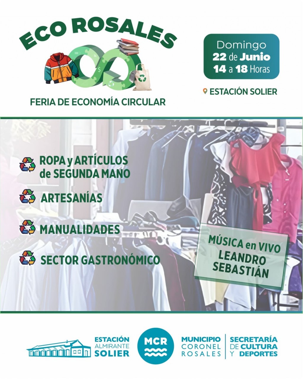 El Municipio de Coronel Rosales invita a toda la comunidad a participar de una nueva edición de la Feria EcoRosales, un espacio dedicado a la economía circular y la economía popular, que promueve el consumo responsable y la reducción de residuos. � � Fecha: Domingo 22 de junio � � Lugar: Estación Solier (Rosales 900) ⏰ Horario: De 14 a 18 h En esta feria, más de 120 feriantes ofrecerán una variada gama de productos reutilizables y reciclados en excelente estado, contribuyendo a extender su vida útil y reduciendo el impacto ambiental. Además, se sumarán propuestas de artesanías, manualidades, un sector gastronómico para disfrutar de una gran variedad de sabores y música en vivo. Recordamos que para participar de la próxima feria de la ECO Rosales se pueden contactar con la Secretaría de Cultura y Deporte a través de sus redes sociales ¡Los esperamos!