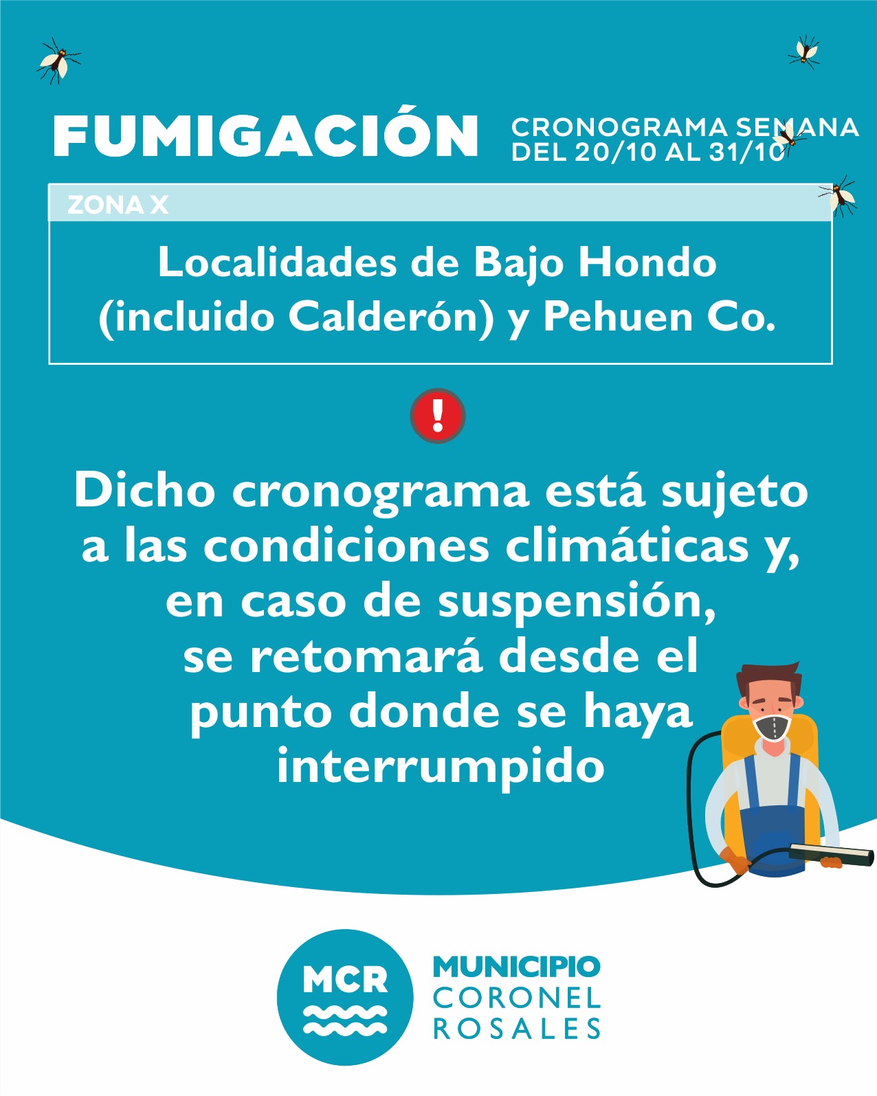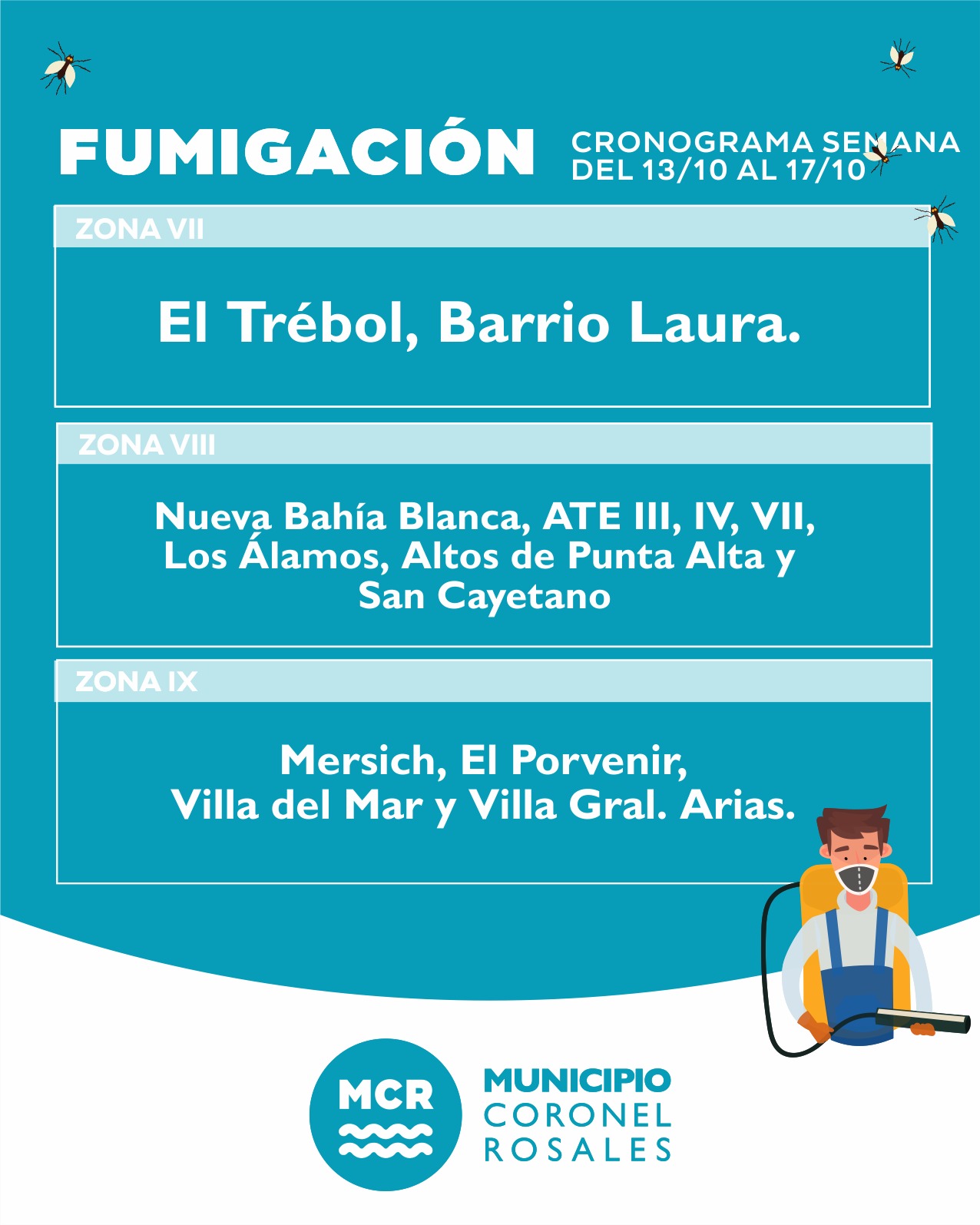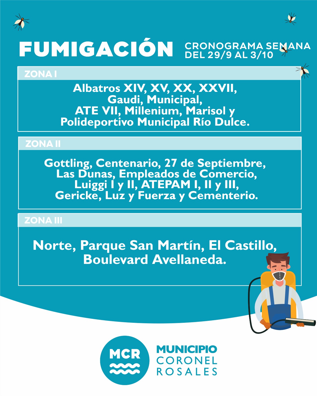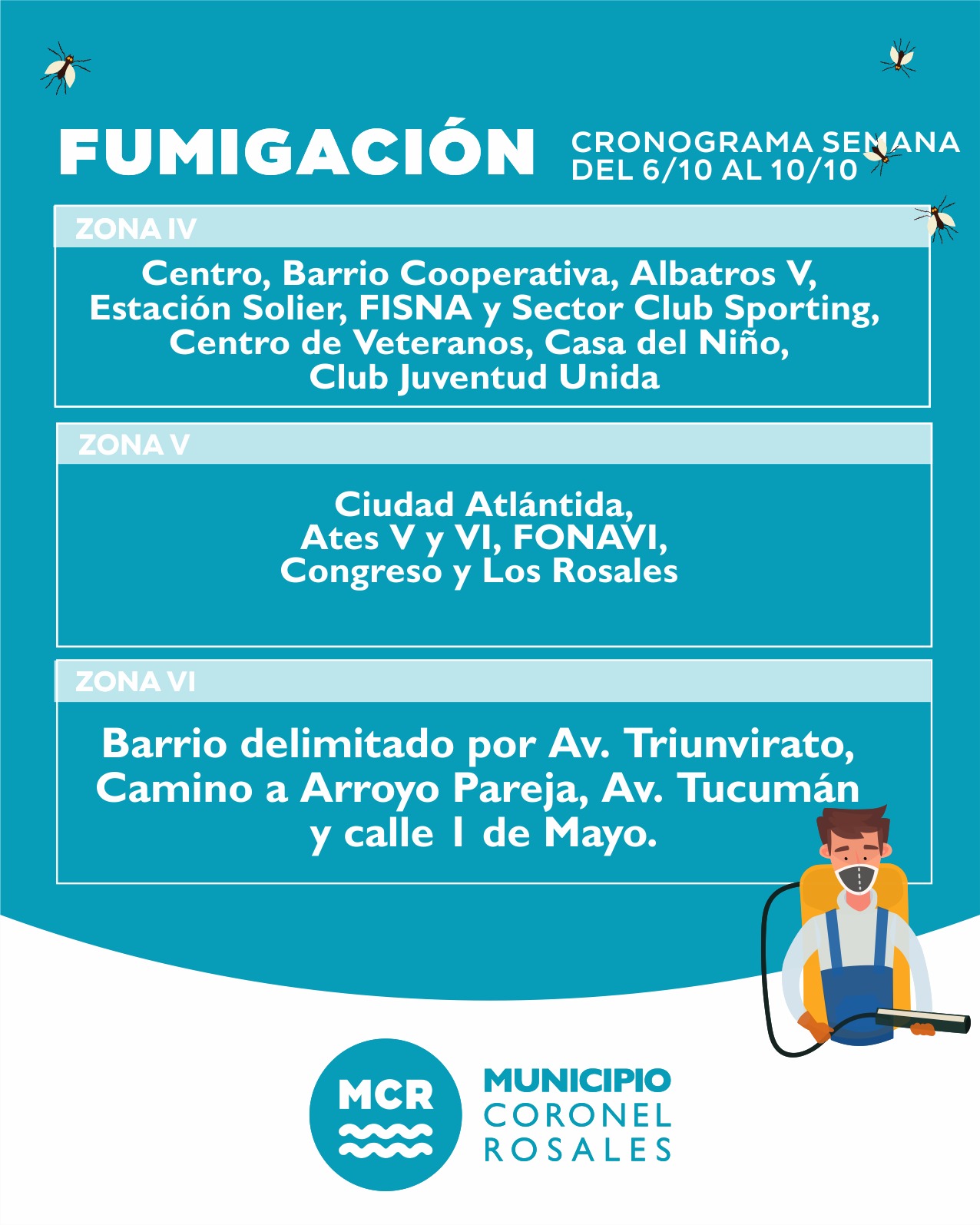 La Municipalidad de Coronel Rosales informa que esta semana comenzó el cronograma de fumigación 2025-2026, que abarcará distintas zonas del distrito.