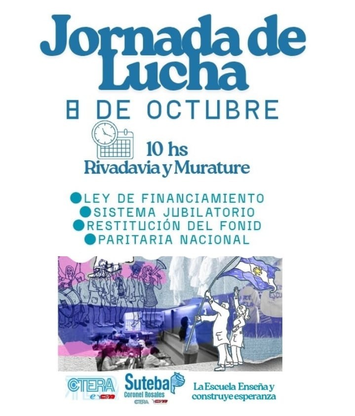 En el marco del plan de lucha de CTERA, este miércoles desde las 10 hs el SUTEBA Coronel Rosales realizará una clase abierta en Murature y Rivadavia. La actividad abordará temas como el financiamiento educativo, el rechazo al Presupuesto 2026 y el impacto del desfinanciamiento en las escuelas. También se recolectarán firmas para un petitorio que será presentado en el HCD