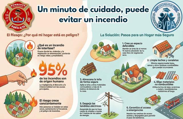Bajo el lema “Un minuto de cuidado puede evitar un incendio”, los Bomberos Voluntarios de Punta Alta, a través de su Departamento de Capacitación, difundieron una serie de recomendaciones destinadas a reducir el riesgo de incendios en viviendas ubicadas en zonas de interfaz, donde conviven áreas urbanas y sectores con vegetación.